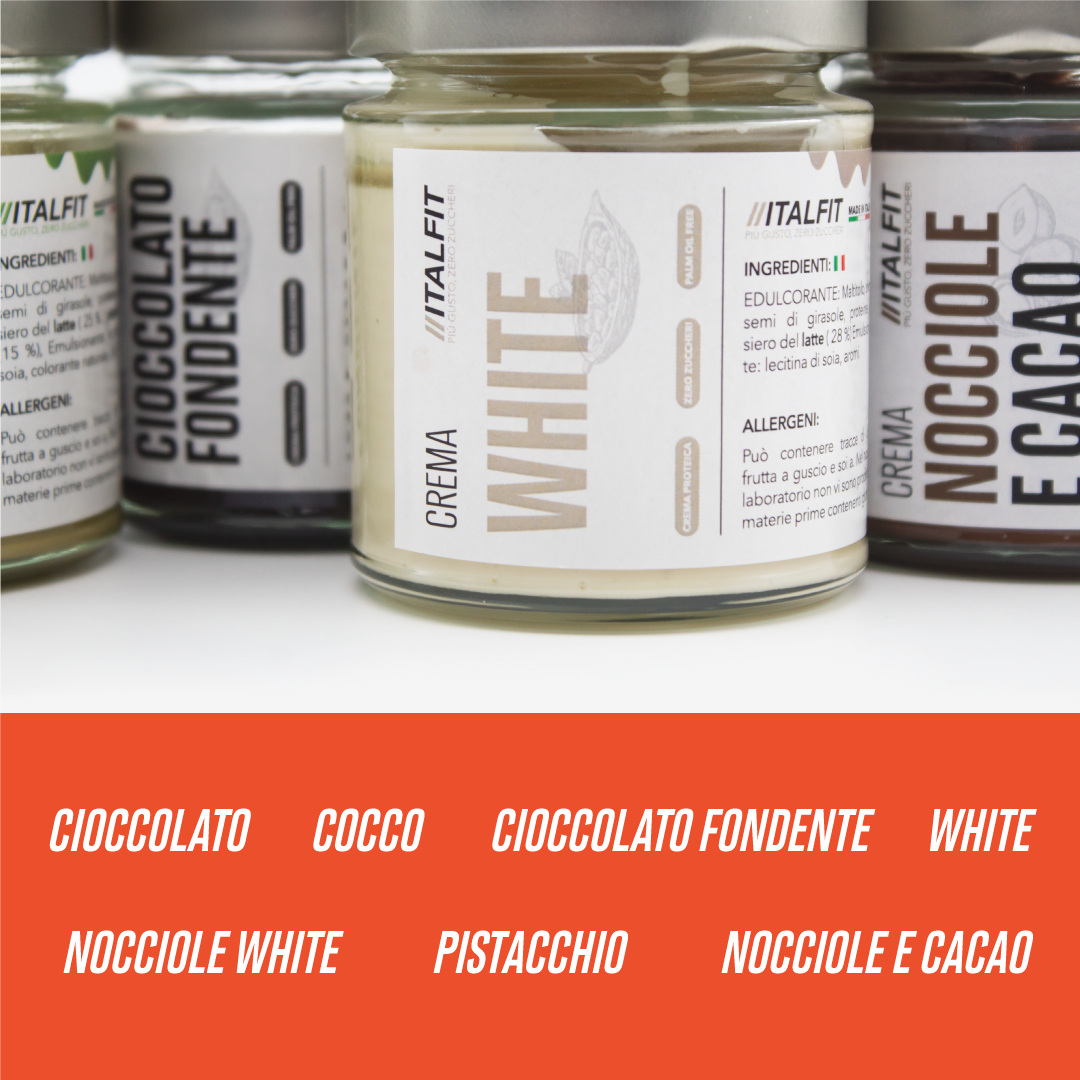 Creme fit senza zuccheri aggiunti, senza olio di palma, senza glutine e ad alto contenuto di proteine. Ottime da spalmare su una fetta di pane o per farcire qualsiasi dolce senza rimorsi.