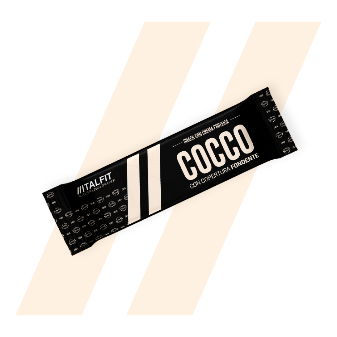 Cialda di wafer ricoperta di cioccolato fondente e ripiena di crema al cocco, ad elevato contenuto di proteine. Dolcificato con edulcoranti. Senza Glutine.